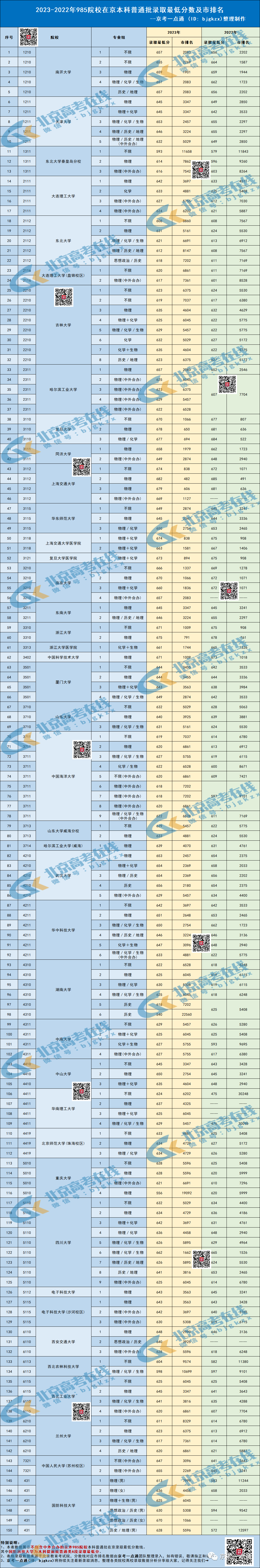 随着北京高招各院校录取数据出炉,同学和家长们比较关注985院校录取分数线是多少?市排名多少可以上985院校?和去年相比,录取数据有何变化?北京高考在线整理了2023-2022年京外985院校本科普通批在京录取最低分数对应市排名,新高一高二高三的同学及家长重点关注!