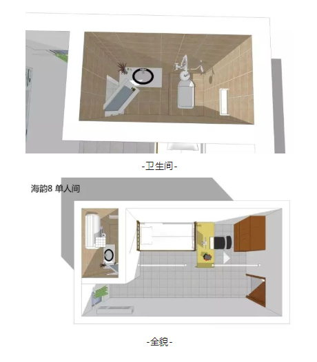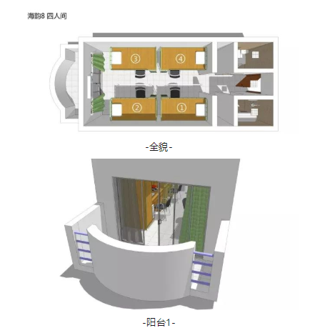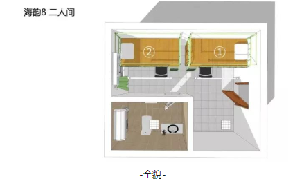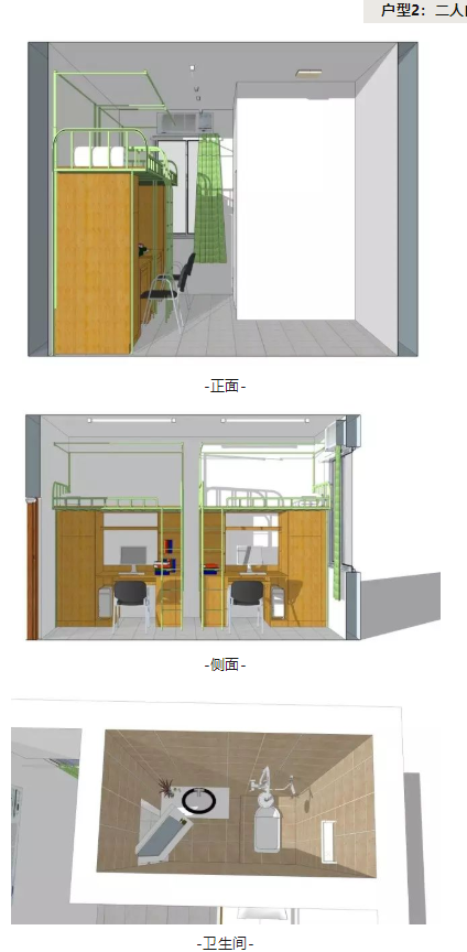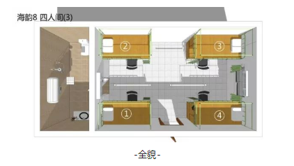 (2) 二人间:长4.30米,宽3.4米,高3.20米。 床铺长度:1.90m,宽:90cm