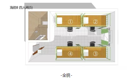 (3) 四人间1:长5.3米,宽3.5米,高3.20米。 床铺长度:1.90m,宽:90cm