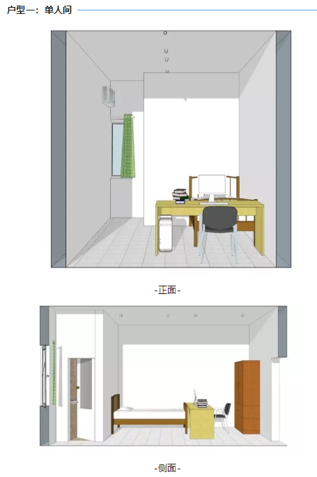 (1) 单人间:长5.0米,宽2.8米,高3.20米。 床铺长度:2.00m,宽:90cm