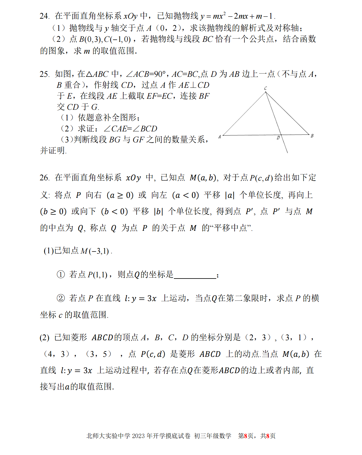 2023年北师大实验中学初三暑假开学摸底考数学试题及答案
