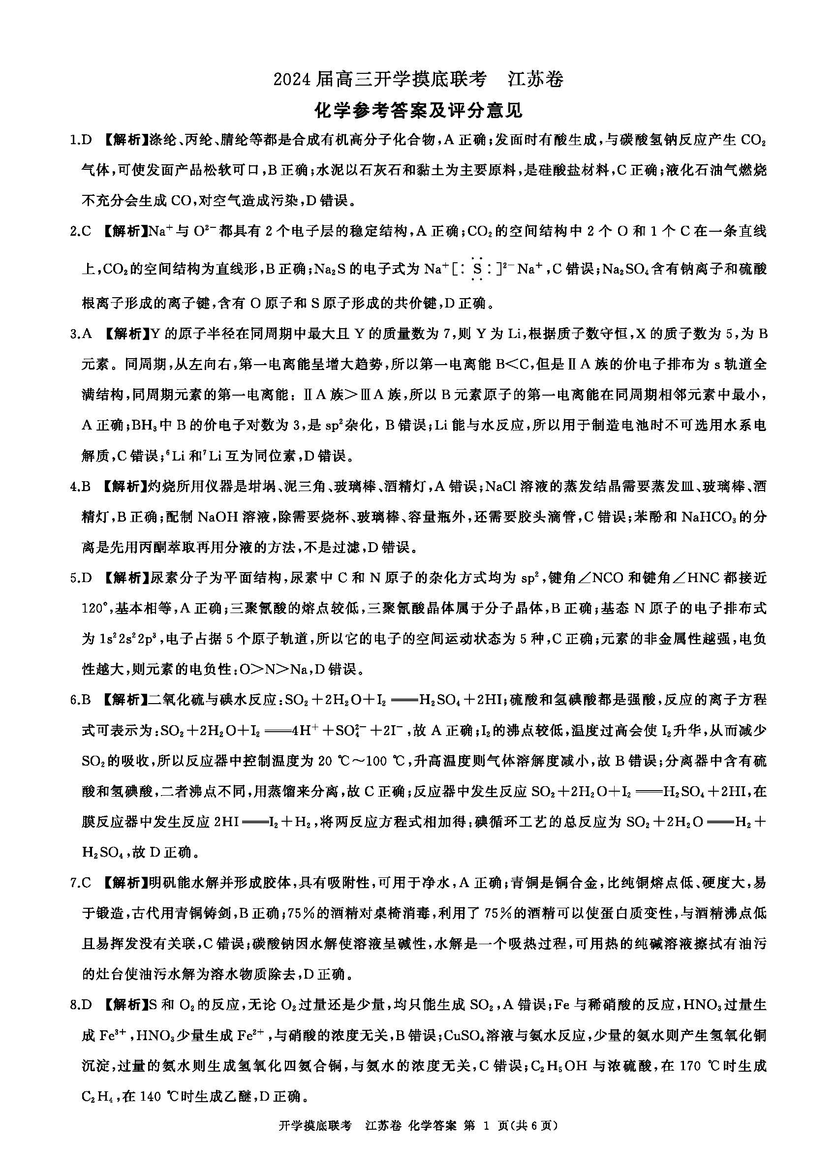 2024百师联盟高三开学考化学试题及答案(江苏卷)