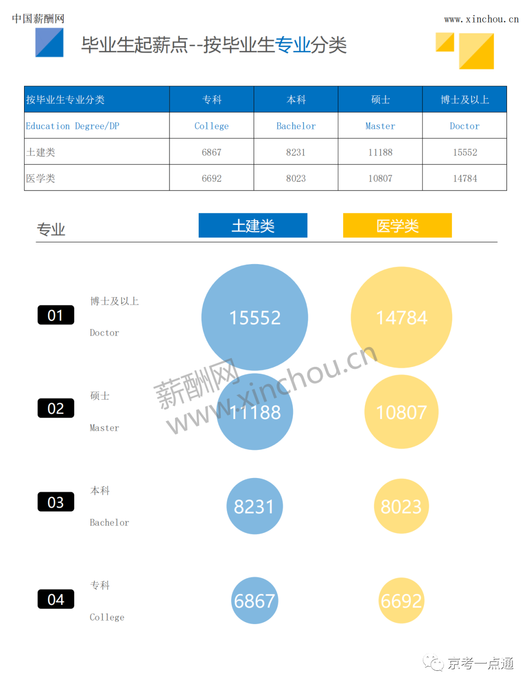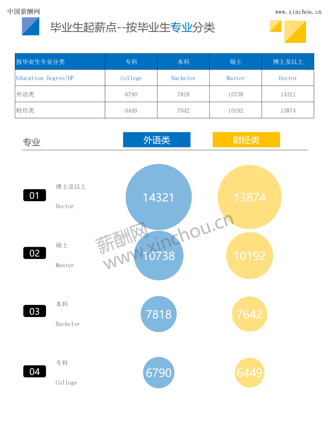 中国薪酬网主要调查的专业有土建类、医学类、外语类、财经类、机械类、工学类、法学类等等。其中,土建类的毕业生起薪点是最高的,其次是医学类、外语类、财经类。