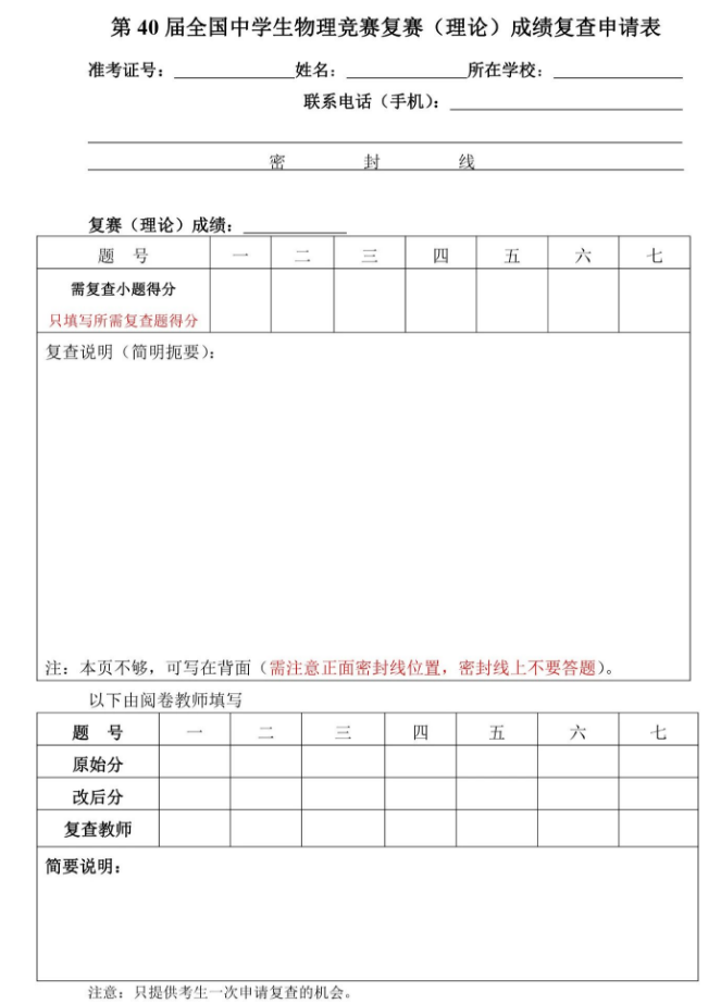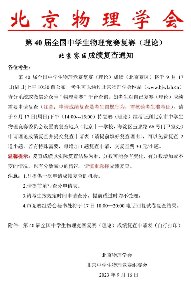 第40届全国中学生物理竞赛复赛(北京赛区)查分通知