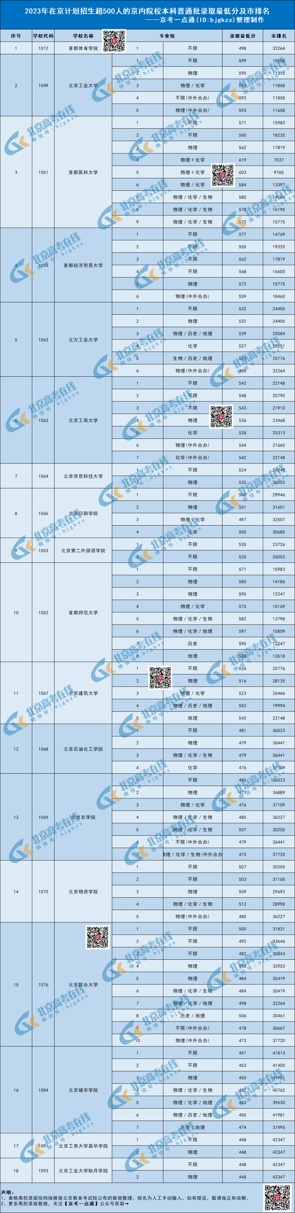 2、以上院校除北京警察学院在京仅在本科提前批普通A段进行招生,其余18所院校均有在本科普通批招生。京考一点通根据以上院校2023年在京最低录取分数线,整理了高、中、低分数段的院校及市排情况,以供意向京内院校的考生参考: