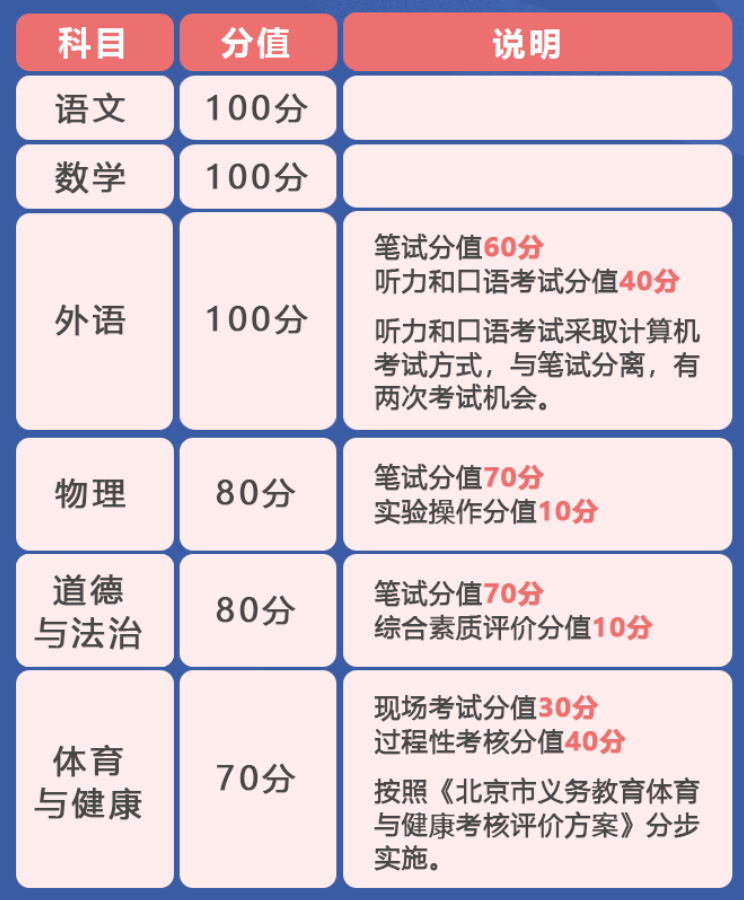 体育与健康分值为70分,其中现场考试分值30分、过程性考核40分,按照《北京市义务教育体育与健康考核评价方案》分步实施。