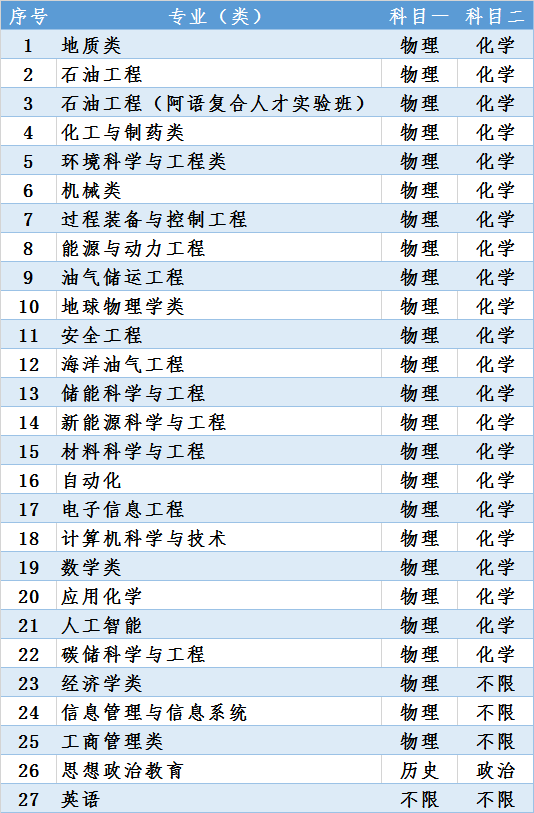 中国石油大学(北京)2024年高考改革省份本科招生专业选考科目要求
