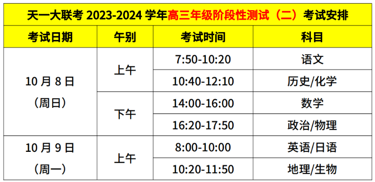 2023年10月8-9日,天一大联考2024届高三二联考试正式举行,北京高考在线团队整理了本次阶段性测试(二)考试时间安排,分享给大家参考。