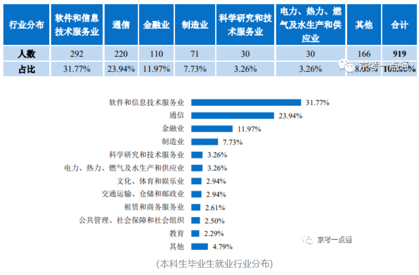 从行业分布情况看,2022届本科生毕业生就业行业主要集中在“软件和信息技术服务业”(31.77%)、 “通信”(23.94%)和“金融业”(11.97%)。