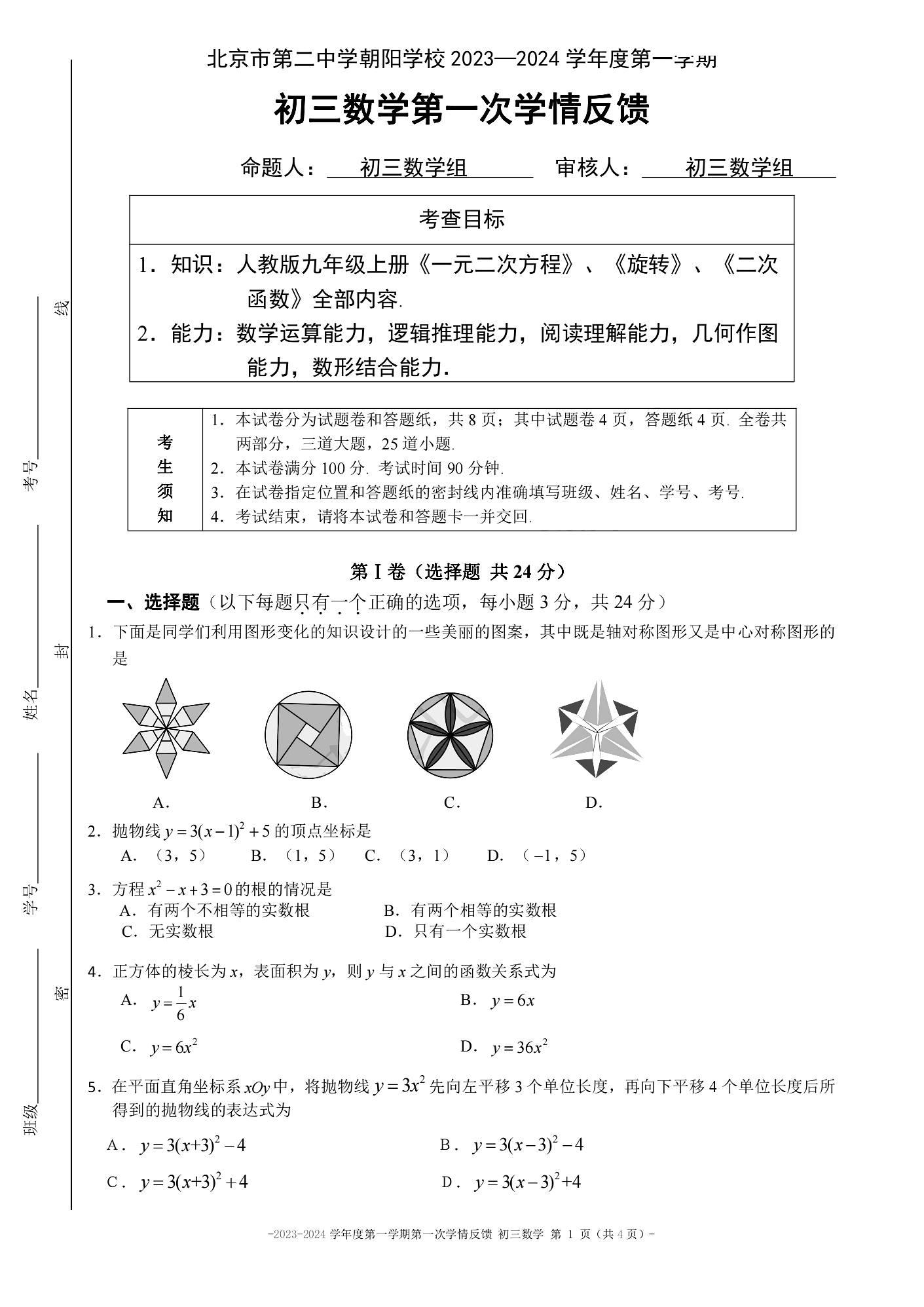 2023-2024年度北京市二中朝阳学校初三九年级(上)数学第一次学情反馈试卷