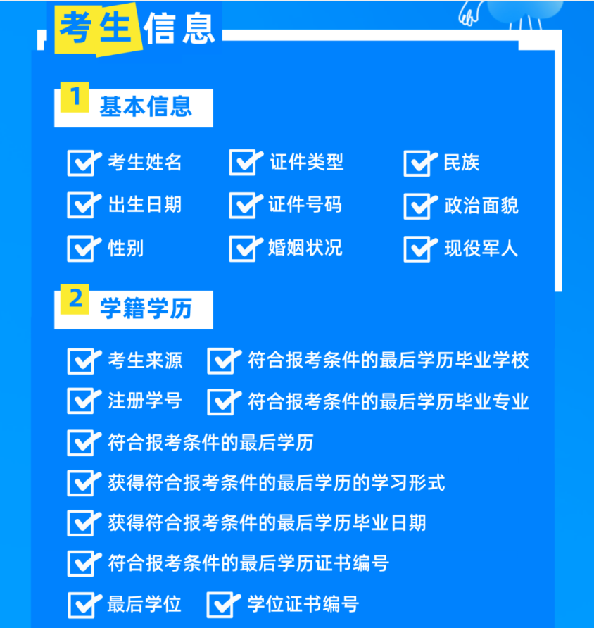 2、如符合报名要求的最后学历对应的是曾用名或曾用证件号码,学历(学籍)校验会不通过。网上的校验结果仅供参考,考生是否具有报考资格由报考点及招生单位根据相关文件确定。未能通过学历(学籍)网上校验的考生应在招生单位规定时间内完成学历(学籍)核验,根据招生单位要求提供相应核验材料,具体时间和要求请咨询招生单位。