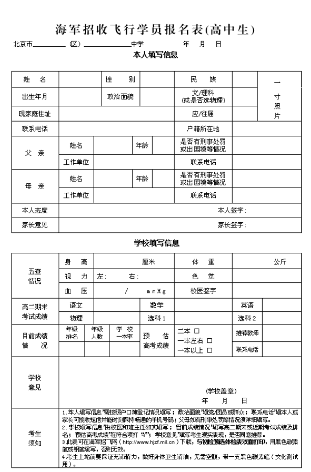 学生携带填写好的《海军招收飞行学员报名表》《海军招收飞行学员初检预选体检表》(正反打印并粘贴一寸免冠照片)、本人身份证(丢失的补办临时身份证或身份证明)、家庭户口簿(原件复印件均可)和黑色碳素笔,由所在学校统一组织,按规定时间地点报到。初检期间,参检学生和带队教师食宿及交通费自理。