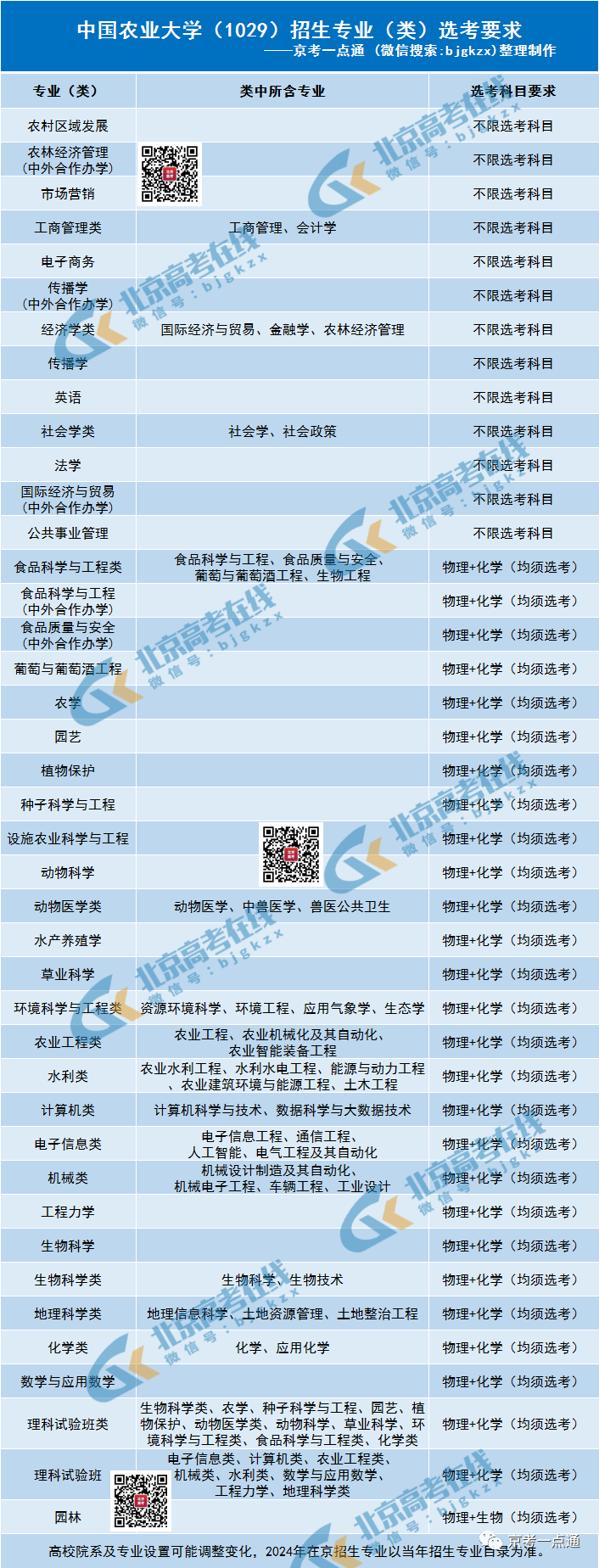 选考要求:2024年高考开始,选科要求发生重大调整,历年的选科要求不再具有参考价值!我们整理了中国农业大学2024招生专业在京选科要求,以供大家参考。特别注意!以下选科要求适用于2024及以后(2025/2026)高考的考生,一起来看