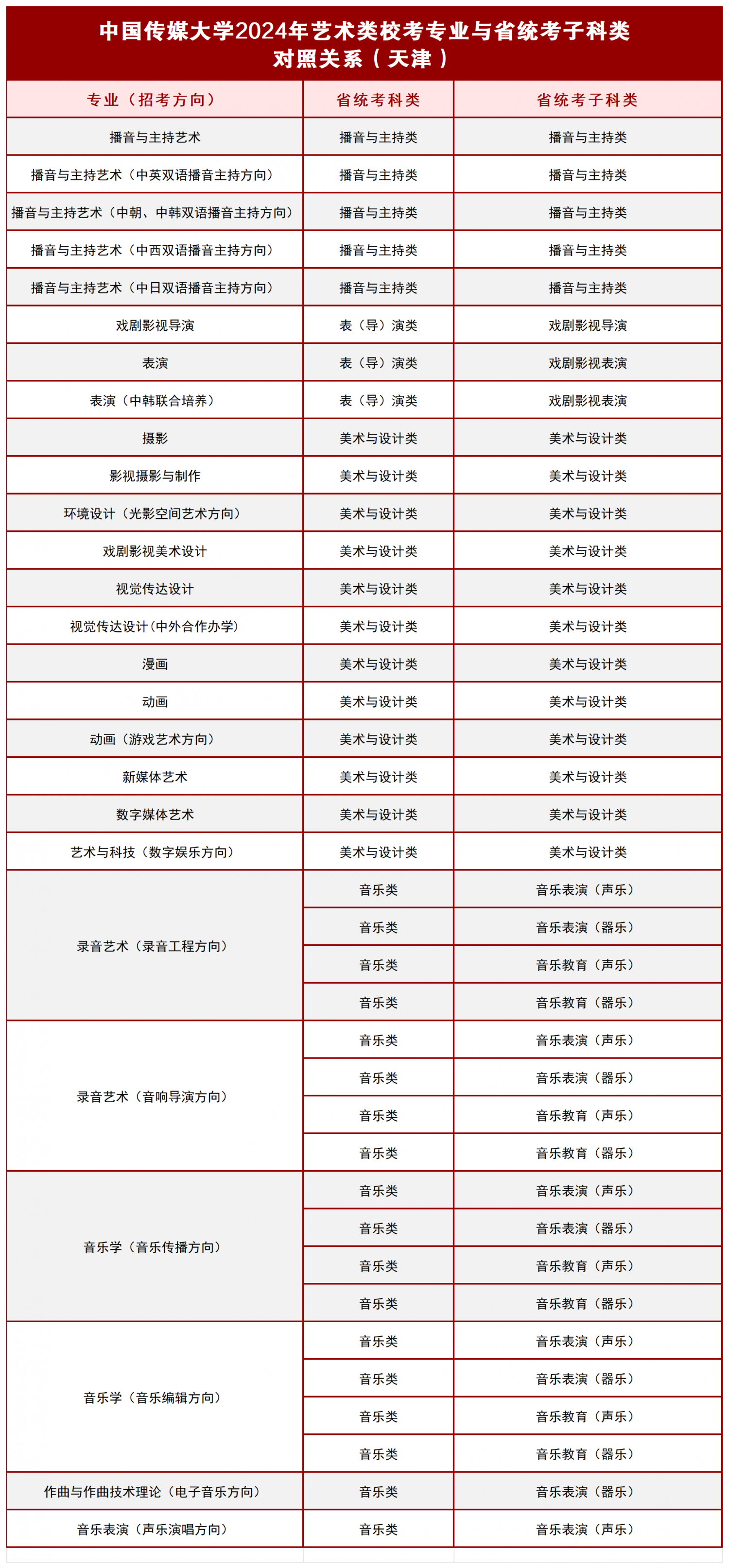 中国传媒大学2024年艺术类校考专业与省统考子科类对照关系(京外地区)