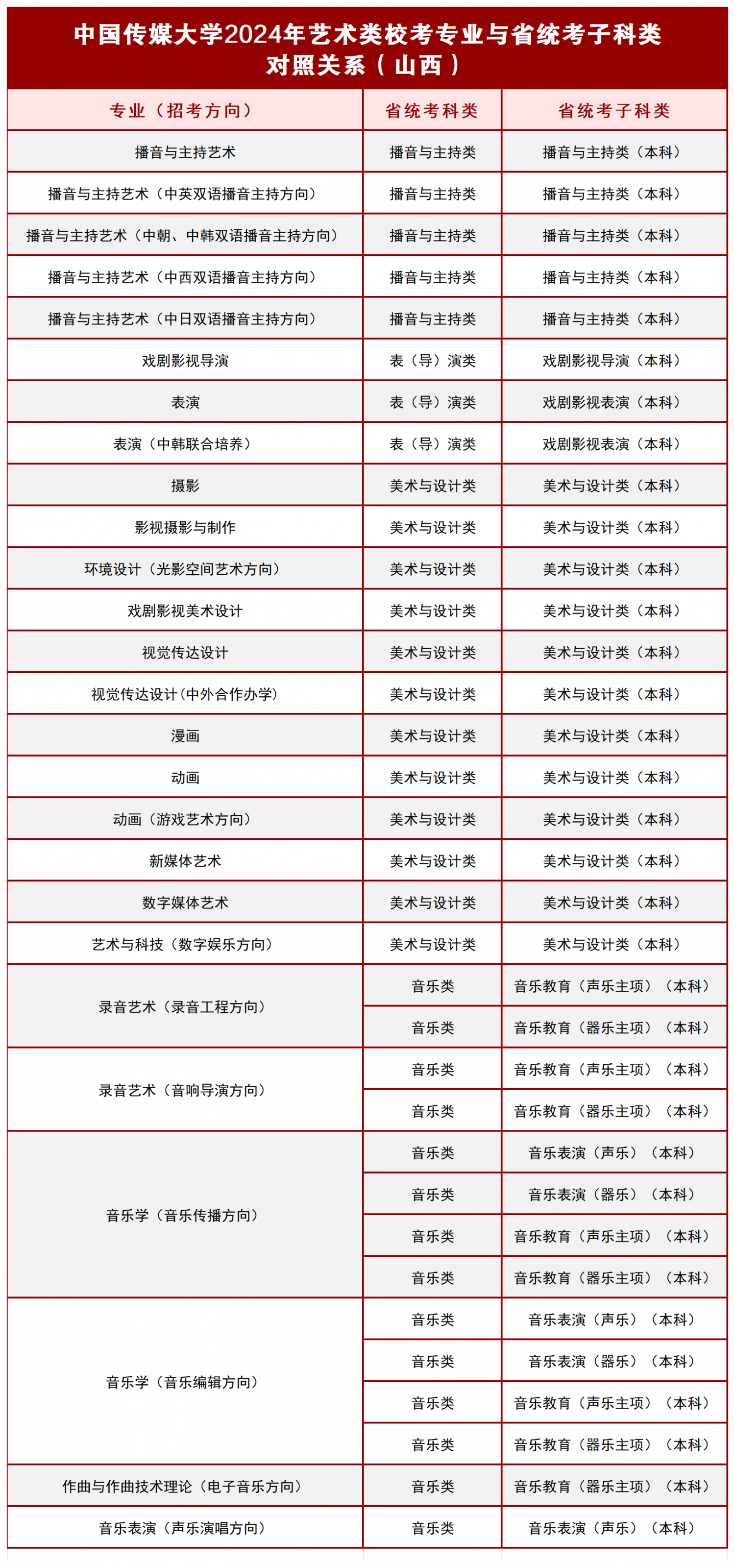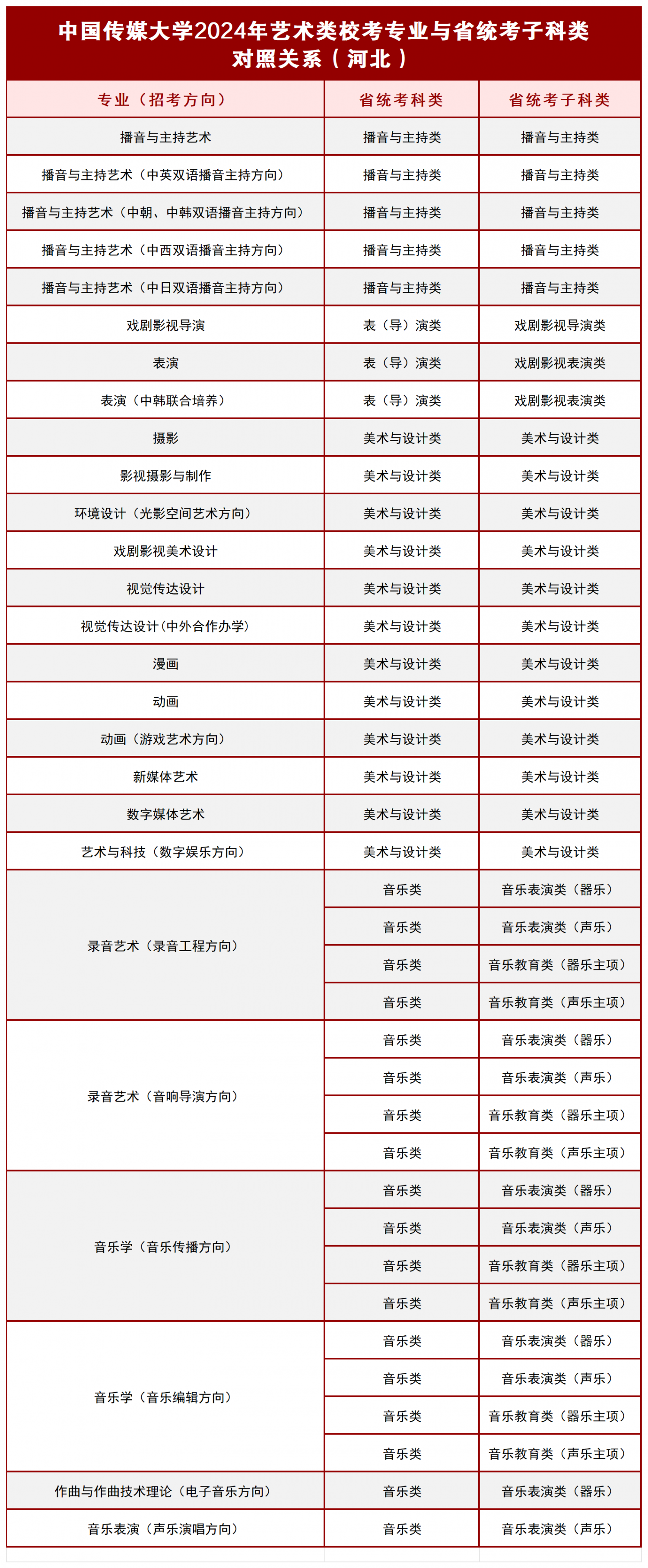 10月25日,中国传媒大学2024年艺术类校考专业与省统考子科类对照关系发布,为此,北京高考在线团队整理了中国传媒大学本科专业与京外地区统考子科类对照关系,详情如下: