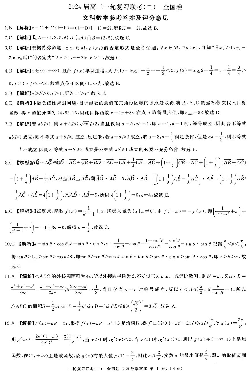 2024届百师联盟10月高三第一轮复习(二)联考文数全国卷试题及答案