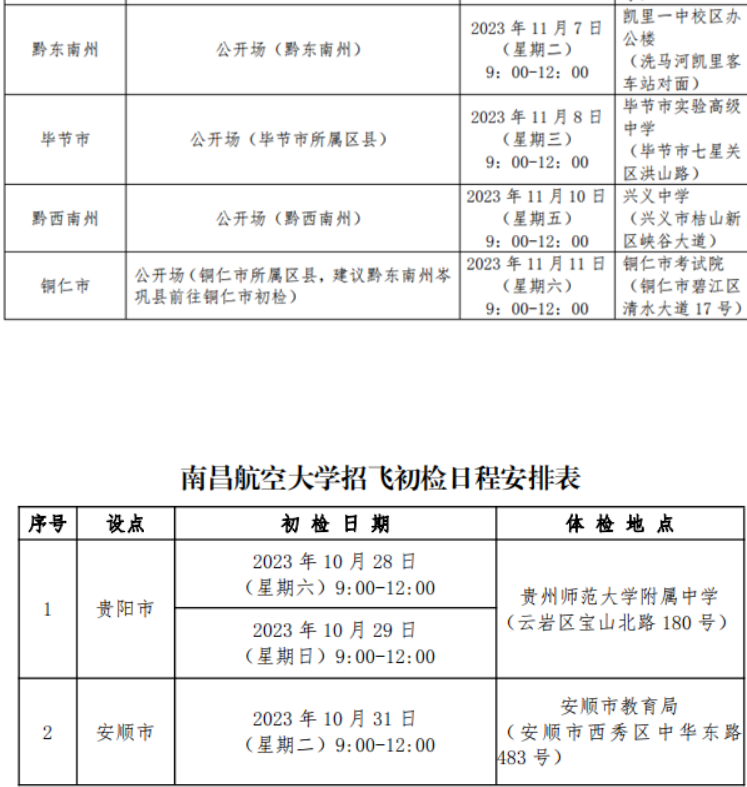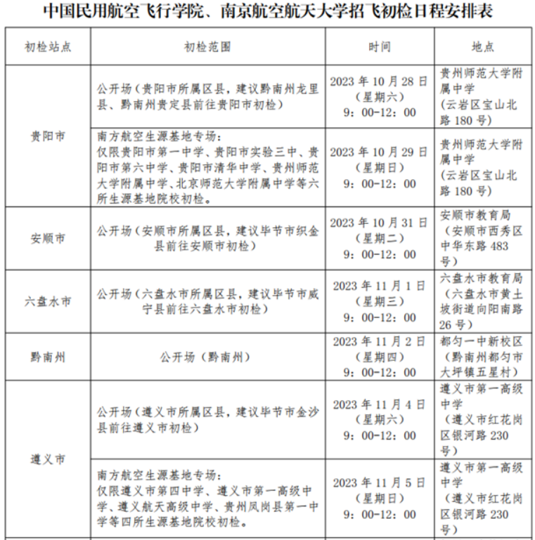 日前,《民用航空招飞信息系统2024年度考生手册》发布,这标志着2024年民航招飞工作正式启动。2024年在我省招收飞行技术专业(民航招飞)的院校有:中国民用航空飞行学院(校招、南航委培)、南京航空航天大学(南航委培)、南昌航空大学(多彩贵州航空委培)。考生可登录招生院校官方网站、微信公众号或民航招飞考生平台查看招生院校报名条件、身体条件要求、报考流程等内容。此次招飞初检日程安排如下,欢迎符合条件的考生踊跃报考。