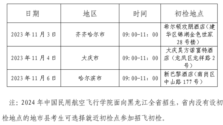 中国民用航空飞行学院2024年黑龙江省招飞初检安排