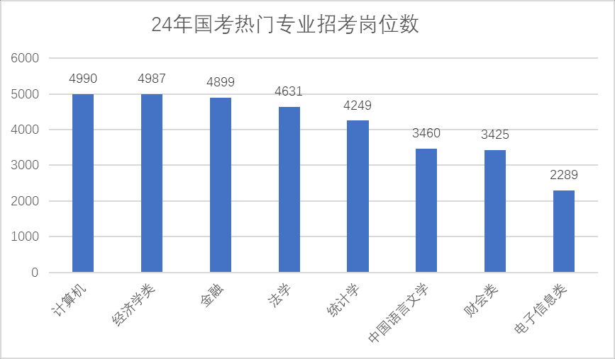 经济学、金融学、计算机、法学、统计学等专业都是招考人数较多的热门专业,从专业上看均超过4000岗。招聘岗位最多的计算机有4990个,23年最热门的经济学类专业可报岗位有6472个,今年下降为4987个。理工科类中可报岗位较多的包括计算机类、统计学类和电子信息类专业等。