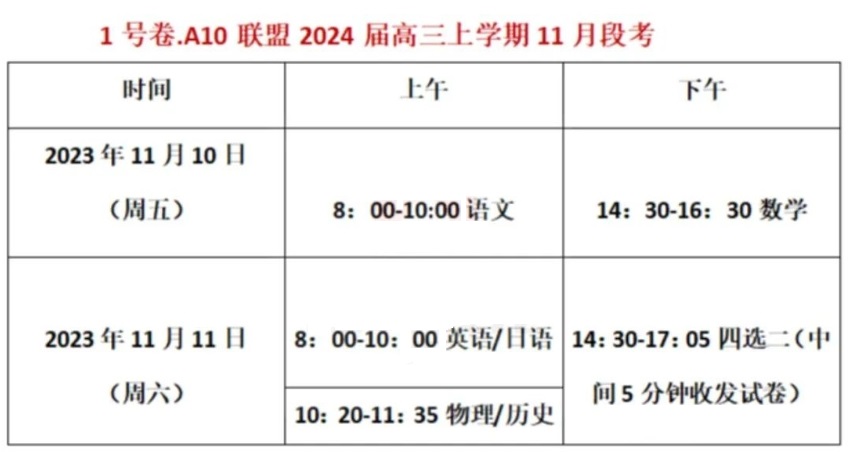 2024年安徽A10联盟高三11月阶段考考试时间安排