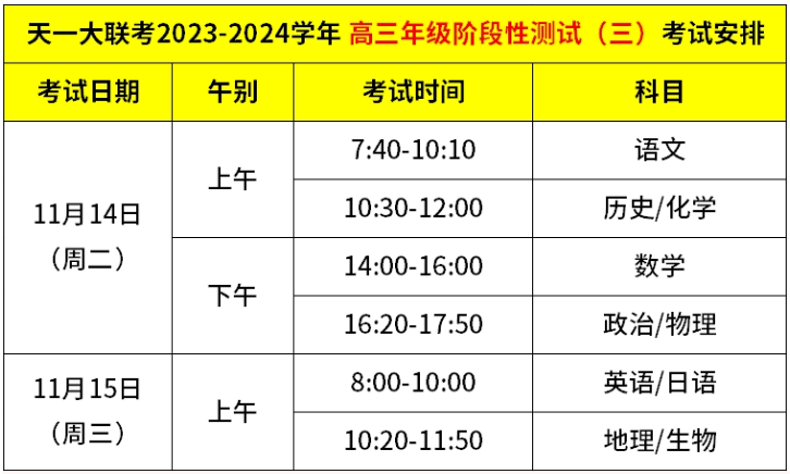 2023年11月14-15日,天一大联考2024届高三三联考试正式举行,北京高考在线团队整理了本次阶段性测试(三)各科考试时间安排,此外联考开始后,还会整理各科试题及答案,分享给大家下载练习。