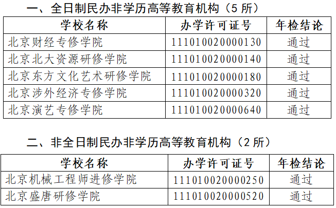 根据《关于开展北京市民办高等学校 民办非学历高等教育机构2022年度办学状况检查评估工作的通知》(京教民〔2023〕1号)、《北京市教育委员会关于2022年度民办高等学校 民办非学历高等教育机构办学状况检查评估结果(第一批)的通知》(京教函〔2023〕280号),经专家验收、评议,现对第二批“通过”等次学校的年检结论予以公布。