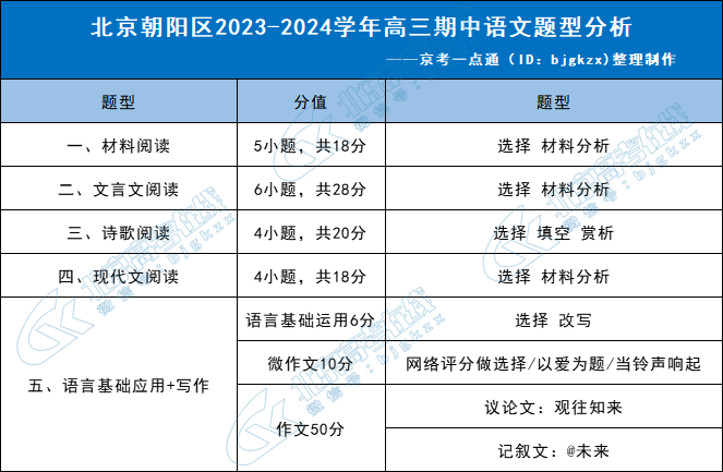 2023-2024学年北京朝阳区高三期中已于11月10日结束,为了帮助同学们了解语文题型情况,北京高考在线团队特意整理了朝阳区高三期中语文题型分析,详情如下: