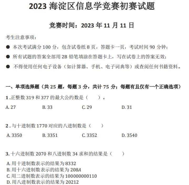 11月11日,2023年海淀区信息学竞赛初赛进行,北京高考在线团队整理了相关试题及参考答案,详情如下:
