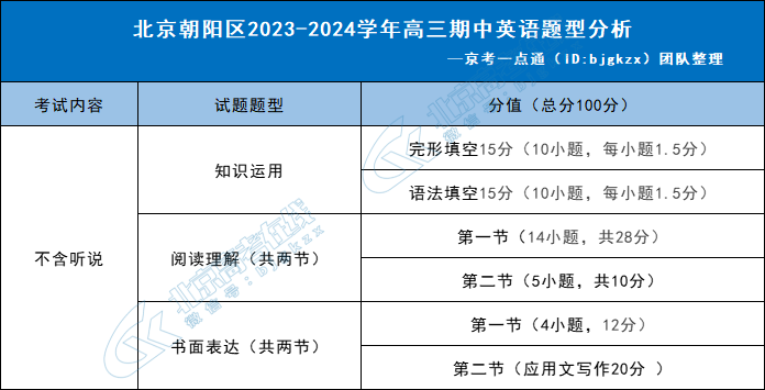 2023-2024学年北京朝阳区高三期中已于11月10日结束,为了帮助同学们了解题型情况,北京高考在线团队特意整理了朝阳区高三期中英语题型分析,详情如下: