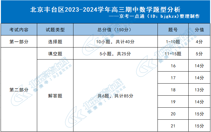 2023-2024学年北京高三期中考试已经结束,为了帮助同学们了解各科目考试题型情况,北京高考在线团队特意整理了2023-2024学年北京丰台区高三期中数学题型分析,详情如下: