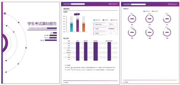 -基础报告主要包含考生总成绩及各单科成绩、各类成绩在全国、全省范围参试群体中的百分比排名、知识点表现、题型表现。