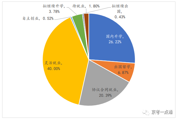 具体去向:协议和合同就业20.39%、国内升学26.22%、出国留学6.87%、灵活就业40.00%、自主创业0.52%、拟继续升学3.78%、拟继续出国0.43%、待就业1.80%。签约率53.48%,比上一年度高 1.34%,创历年新高。