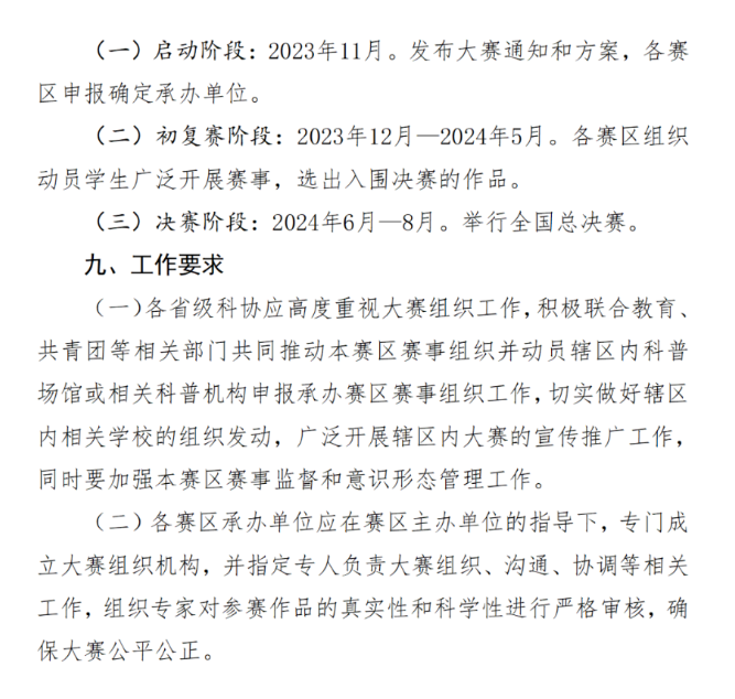 (二)初复赛阶段:2023年12月—2024年5月。各赛区组织动员学生广泛开展赛事,选出入围全国总决赛的作品。