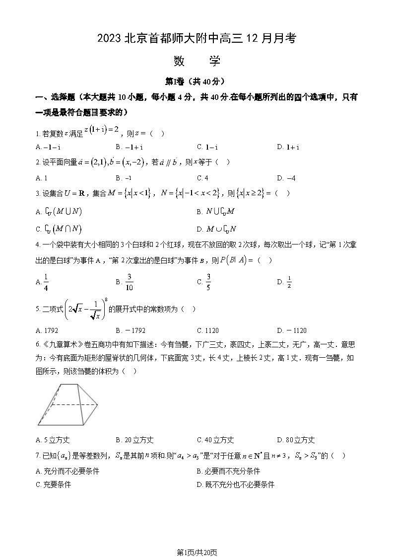 立即下载:首都师范大学附属中学高三2023年12月月考数学试题及答案