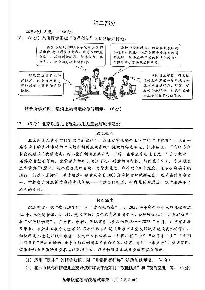 2023-2024学年北京燕山区初三期末道德与法治试题及答案