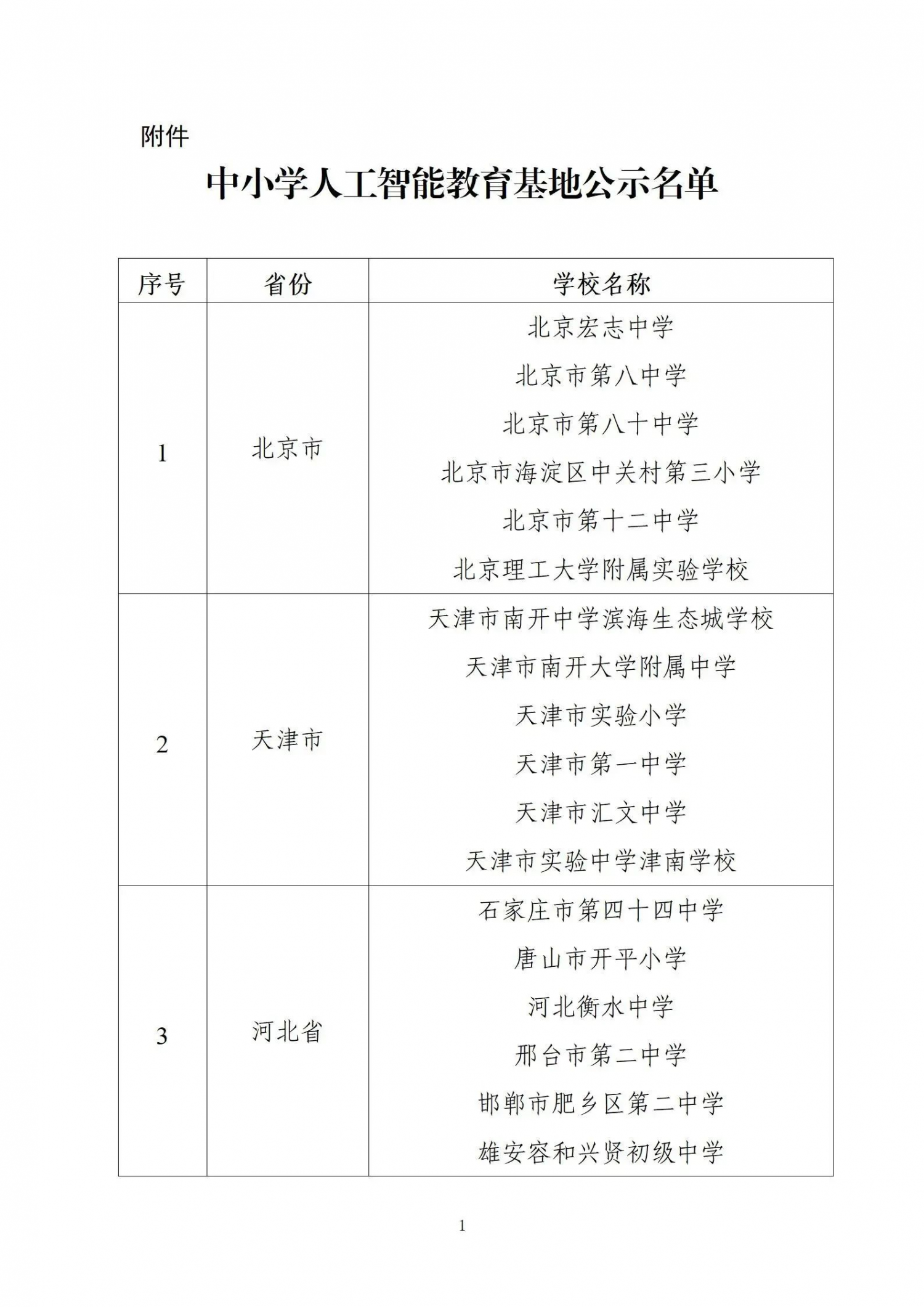 中小学人工智能教育基地公示名单