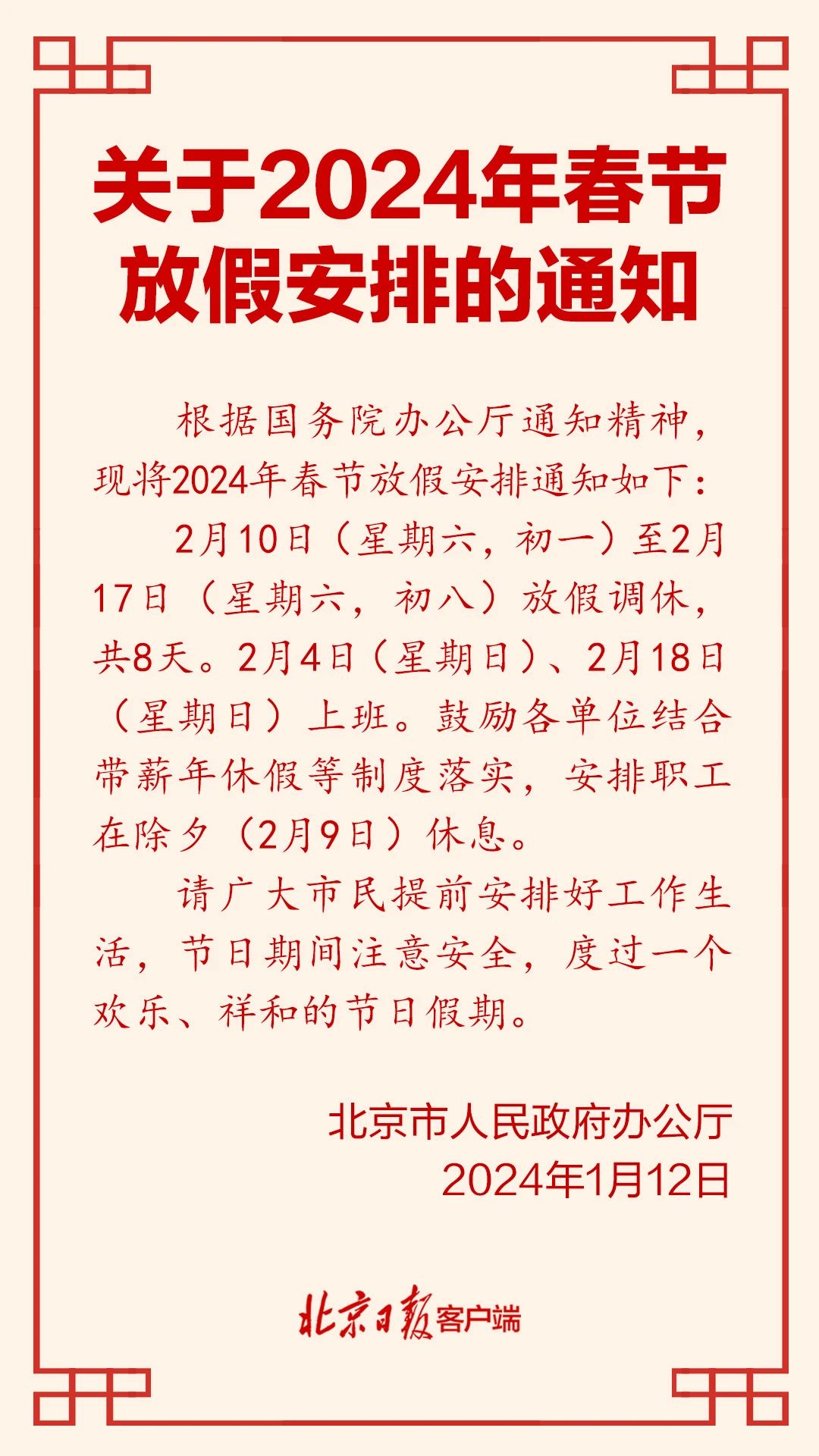 今天(1月12日),北京市人民政府办公厅正式发布关于2024年春节放假安排的通知,具体如下: