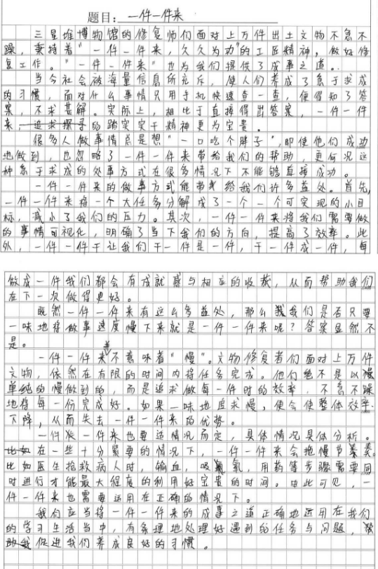 2024北京朝阳区高三期末考试已结束,本次考试语文作文记叙文题目是“质疑·理解·成为”,议论文题目是“一件一件来”,为此,北京高考在线团队整理了一篇议论文“一件一件来”的范文,分享给同学们学习。