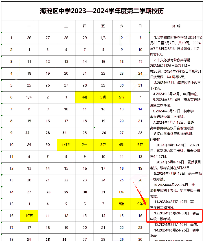 根据收集到的海淀区中学2023-2024学年第二学期校历内容可以知道,海淀初三二模定于2024年5月28日-30日,本文整理了相关介绍,供大家查看。