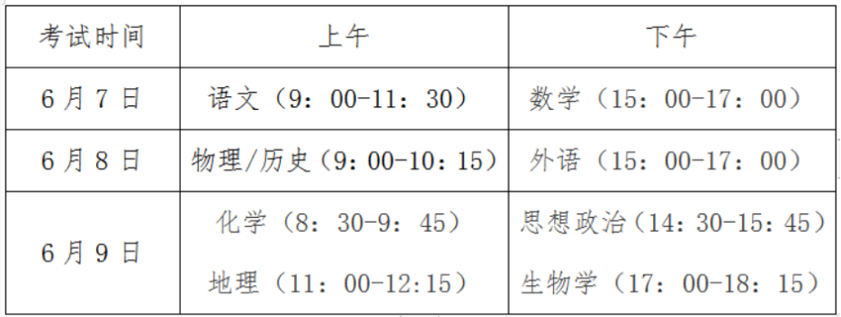 全国统考科目由教育部命题,按教育部规定时间组织考试。选择性考试科目由我省自主命题,每门考试时长均为75分钟,与全国统考科目的考试同期安排。如全国统考科目有调整,选择性考试科目的考试安排相应调整。具体考试时间安排如下: