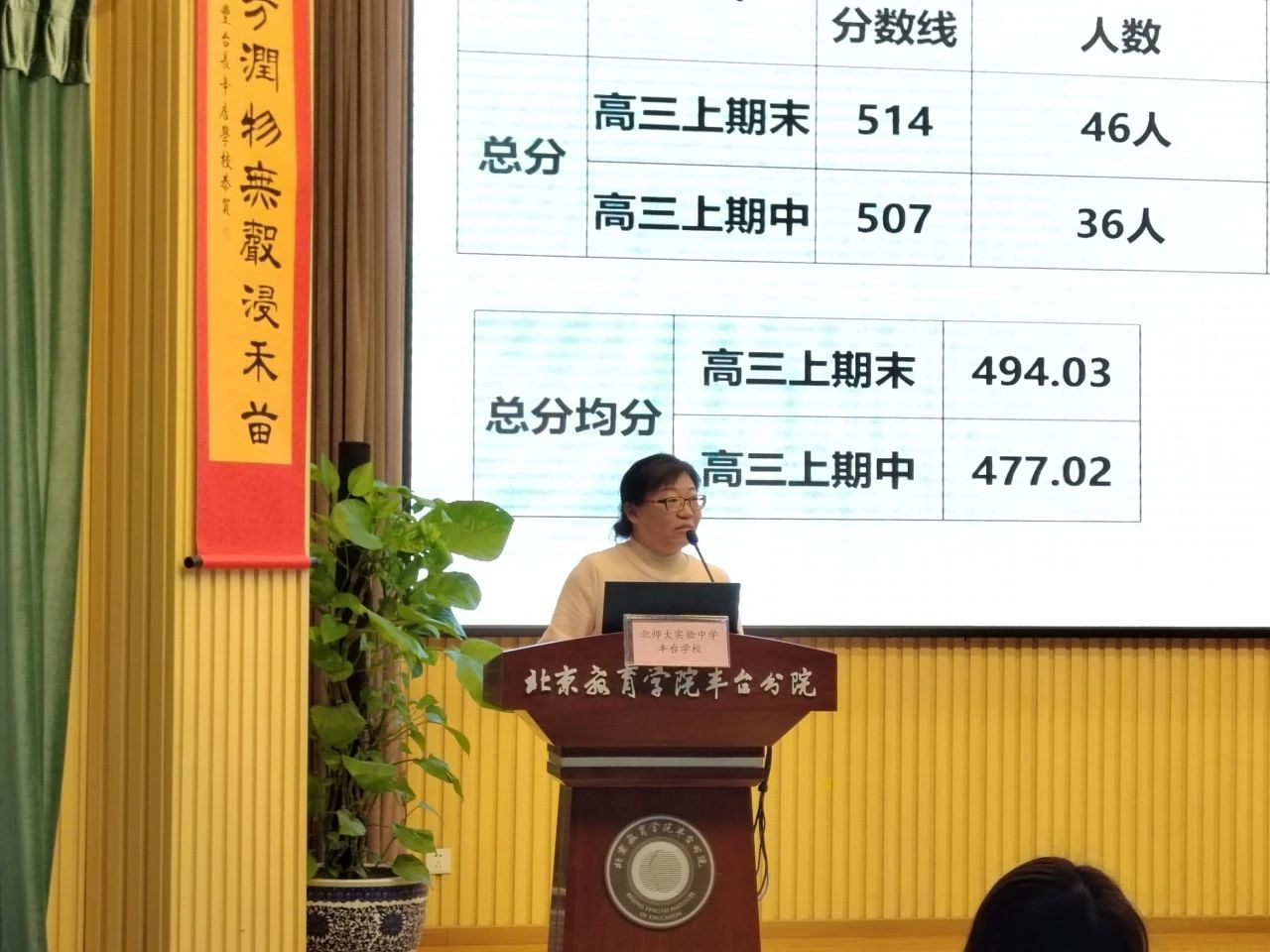 北师大实验中学丰台学校副校长王巍巍从数据分析角度介绍了学校期末考试的基本情况,并从树立目标意识、增强凝聚力、管理助力等方面分享了学校在复习备考方面的具体做法,强调要尊重个体差异、增强人文关怀、树立自强榜样、营造拼搏场域。