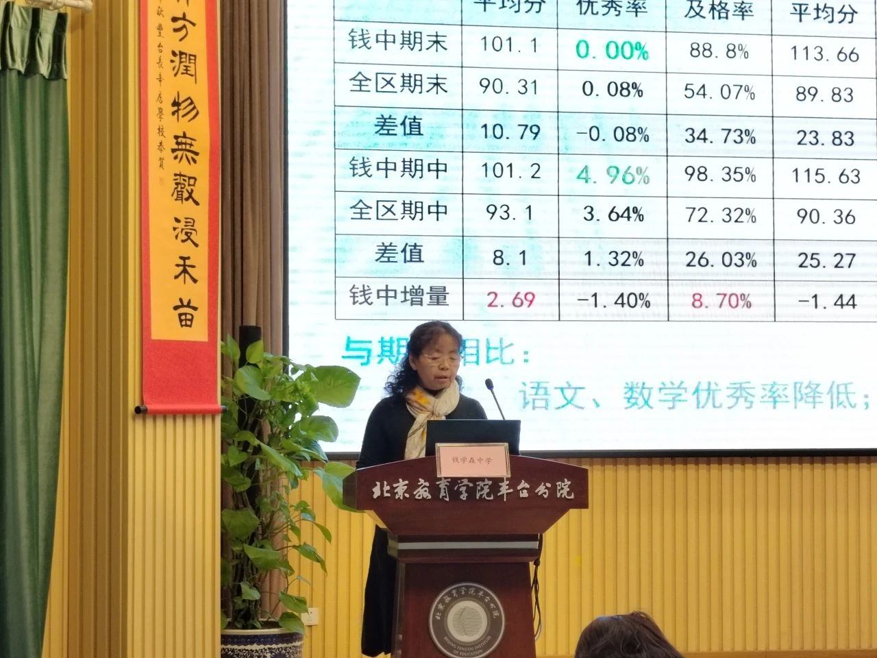 北京钱学森中学副校长杨丽钧以“聚焦问题·求真求实·精准发力”为题,她首先结合本次考试数据及期中考试数据分析了学校各学科的优势和不足,分享了学校基于数据、发现问题并准确归因的经验作法,并从管理层面、年级层面、教师层面、学生层面提出了学校后期精准发力的方向。