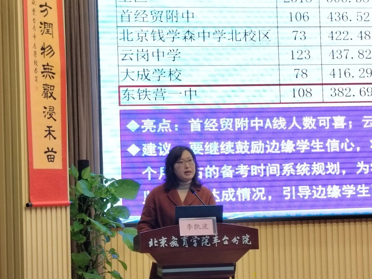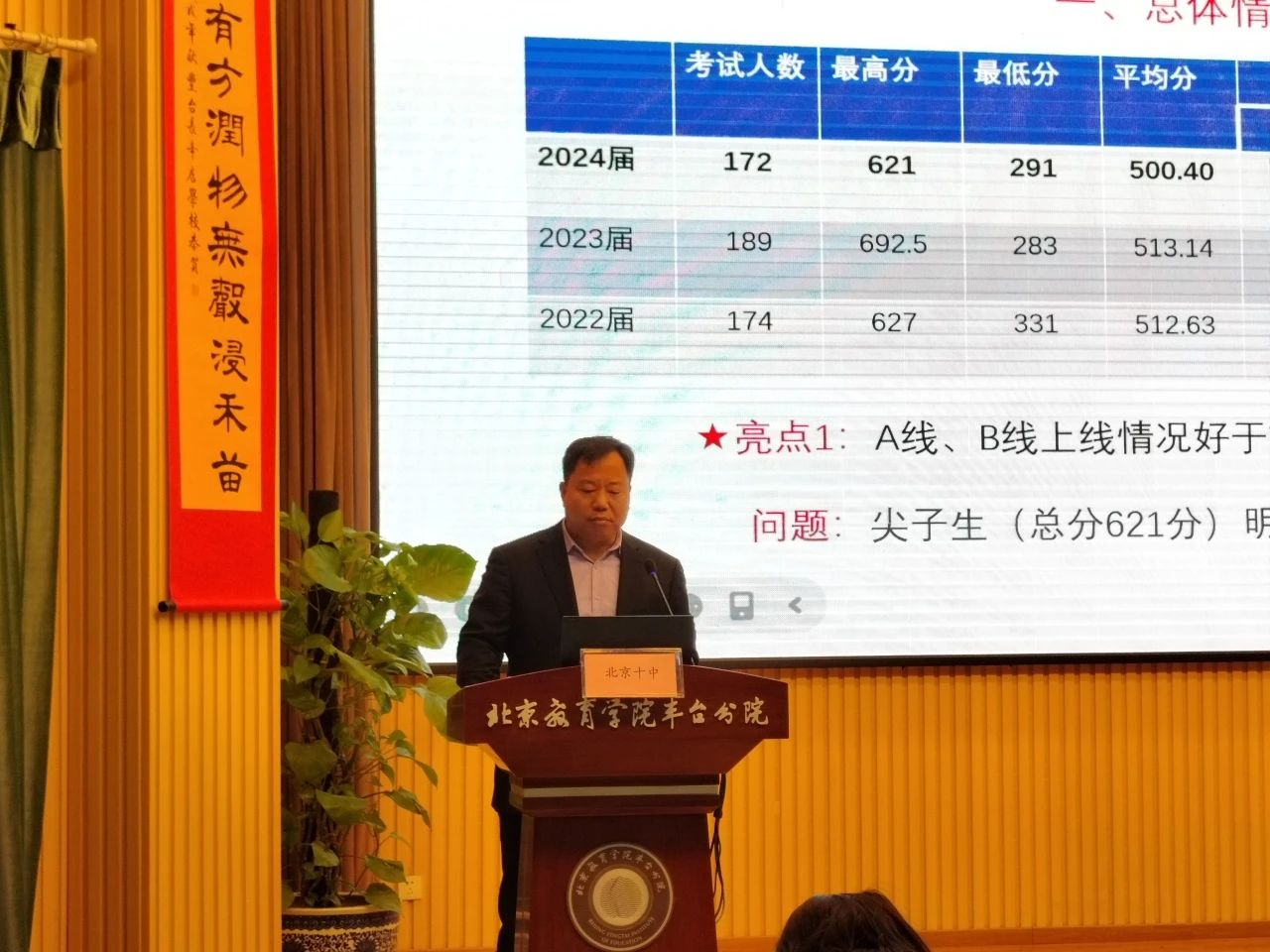 在领导讲话环节,丰台教委副主任郝玉伟首先对大家的发言表达了鼓励和认可,并从成绩分析方面提出工作要求。他要求,做好成绩分析要做到“数据真、说真话、说实话、说有用的话”。他强调,要明确目标,保证高考质量稳中有进;加强对比分析,增加备考复习的信心;加强教学管理,保证高三复习效果并关注高一高二教学。最后,郝主任对未来工作做出工作提示,即关注贯通培养、鼓励多元化办学、把握政策机会、加强对高考多途径入学的研究。