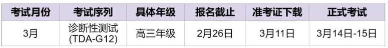 诊断性测试(TDA)面向全国各省份高三年级学生组织考试,2024年2月26日报名截止,3月14日-15日正式考试。北京高考在线团队整理了考试安帕介绍,供大家查看。