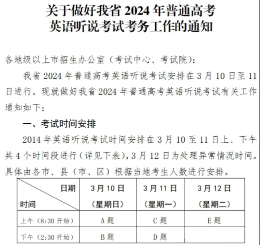 2024年2月,2024年广东高考英语听说考试安排正式公布,考试时间定于3月10日-12日进行,北京高考在线团队整理了考试详细安排,供大家查看。