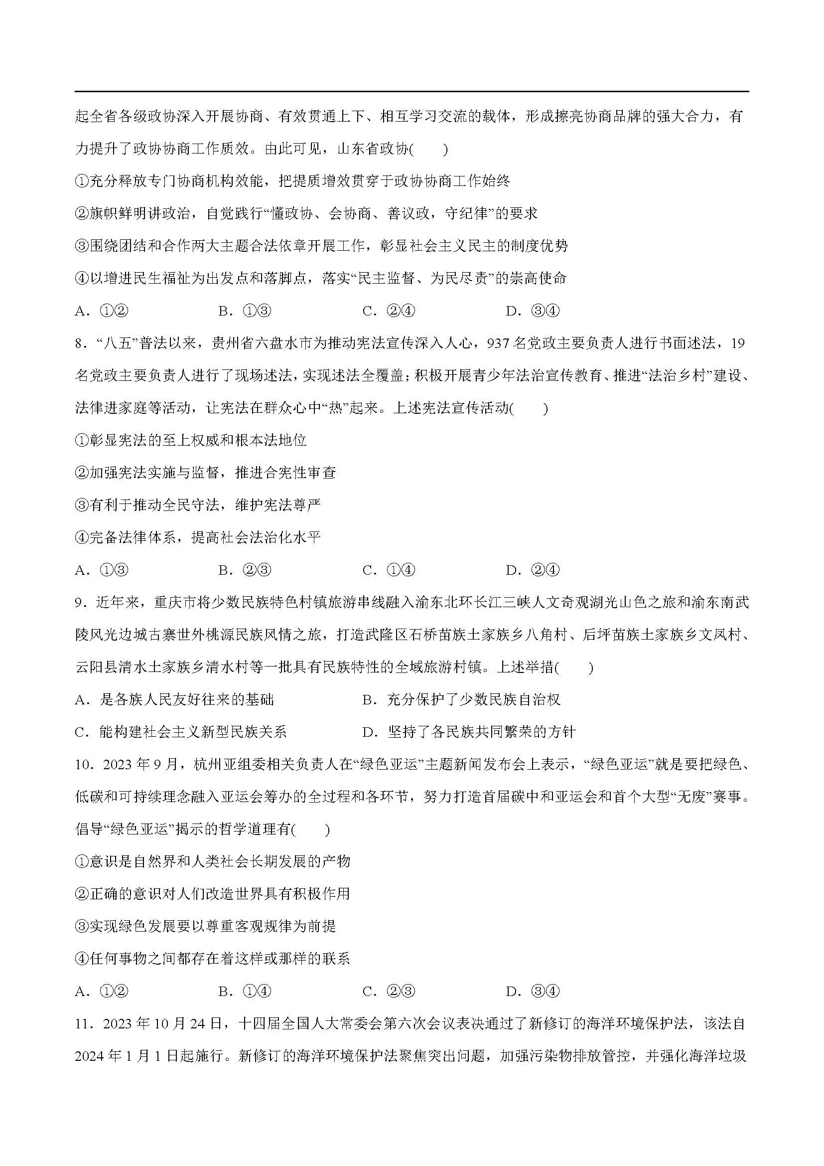 2024年1月九省联考考后提升卷政治试题(贵州卷)