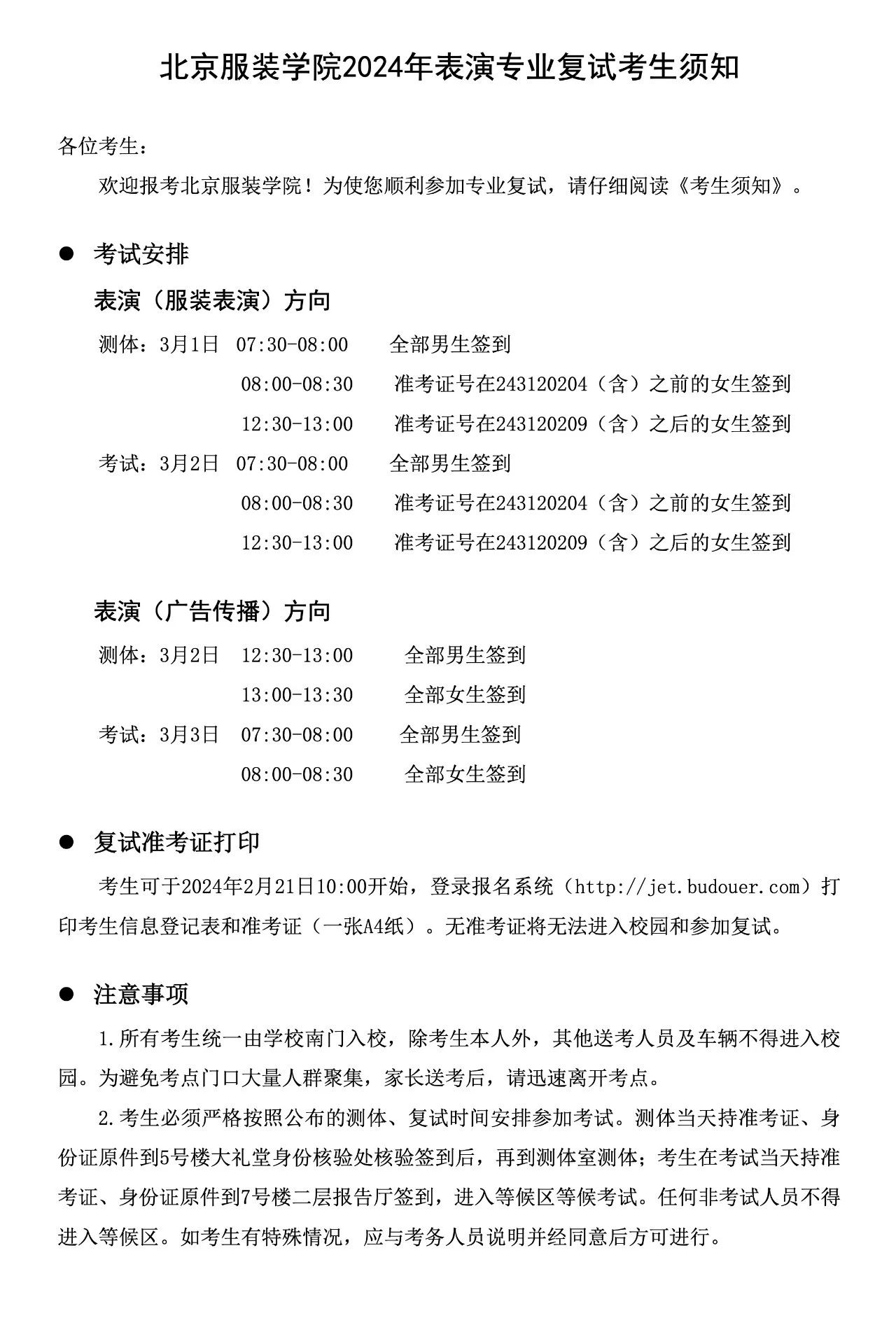 北京服装学院2024年表演专业复试时间定于3月初,考生们记得打印复试准考证。