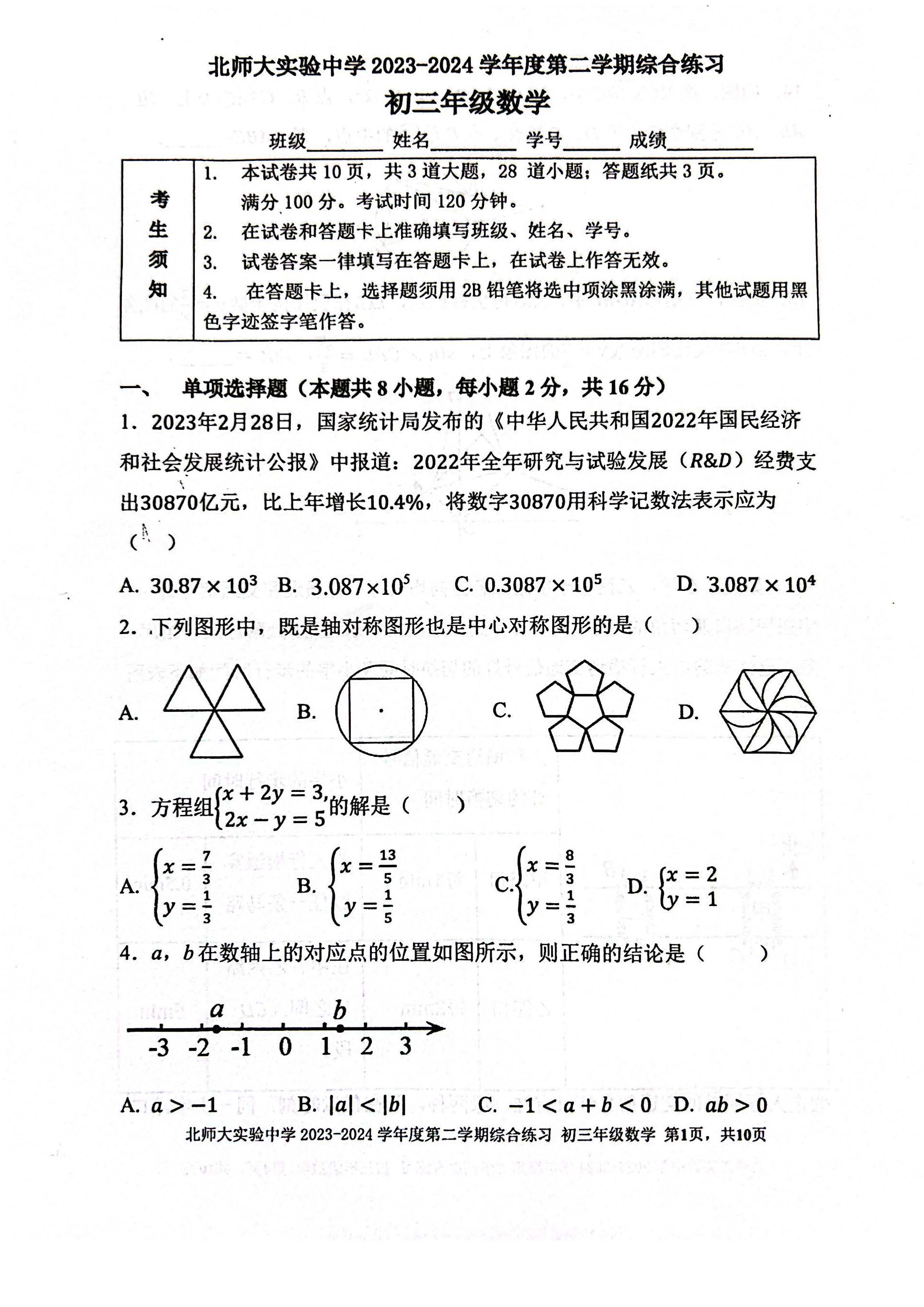 2024届北京师范大学附属实验中学初三2月开学测试数学试题及答案