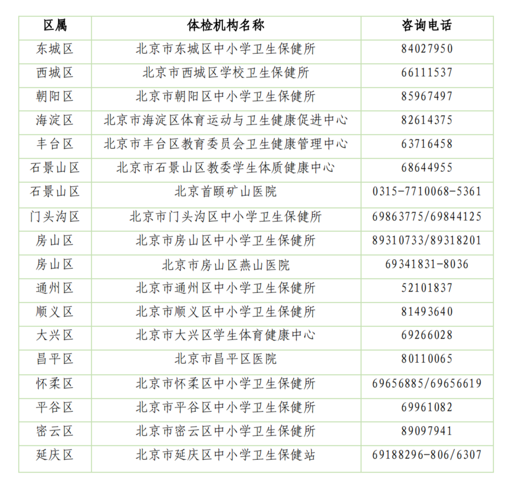 提示:各区中招体检指定机构务必提前一天将会诊学生信息报至北京市体检中心专项业务科(电话68016643、68024448)备案,体检中心将根据会诊项目安排会诊医师;会诊时,考生需携带本区中招体检指定机构开具的会诊介绍信及本人身份证或学生证。