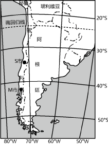 【详解】(2)S市气候特点:S市属于地中海气候,夏季高温少雨,冬季温和湿润。原因:地处30°S~40°S大陆西岸,夏季受副热带高气压带控制,高压控制降水少,冬季受西风影响,从海洋上吹来,带来丰富水汽。或M市气候特点:M市属于温带海洋性气候,全年温和多雨。原因:M市地处40°S~60°S大陆西岸,全年受西风控制,从海洋上吹来,带来丰富水汽,M市位于安第斯山脉西侧,属于山脉迎风坡,导致降水多。